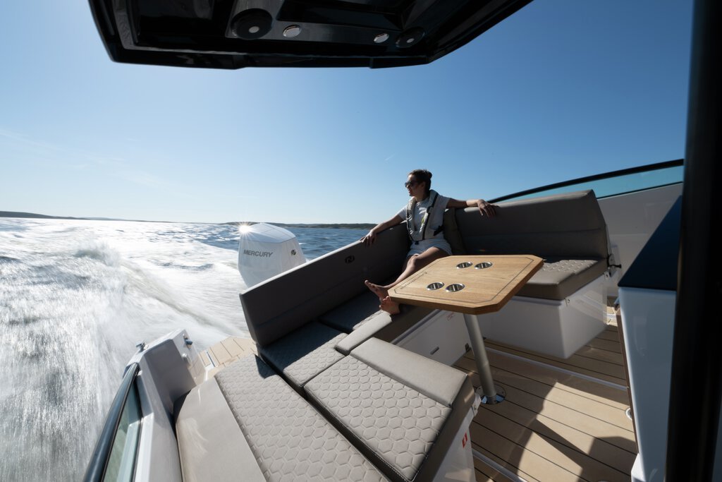 Bancos laterales de popa con respaldo abatible – Solarium de popa más grande de su categoría.